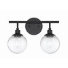 Make a statement with the striking silhouettes of the Que collection. Clear seeded glass globes in updated silhouettes offer a fresh look to brighten your home. Clear Seeded Glass Shades (included) Requires 2 Candelabra base, 40 watt bulbs (not incl 1 Year Mounting Direction: Up/Down Shade Included: Yes Material: Steel, Finish Color: Flat Black, Width: 14.5", Height: 10.5", Length: 14.5", Depth: 7.25", Height From Outlet Box: 2.5", Backplate Width: 5", Backplate Length: 5", Number Of Bulbs: 2, Wattage: 40 Watts, Dimmable: No, Moisture Rating: Damp Rated