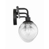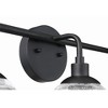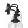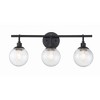 Make a statement with the striking silhouettes of the Que collection. Clear seeded glass globes in updated silhouettes offer a fresh look to brighten your home. Clear Seeded Glass Shades (included) Requires 3 Candelabra base, 40 watt bulbs (not incl 1 Year Mounting Direction: Up/Down Shade Included: Yes Material: Steel, Finish Color: Flat Black, Width: 23.75", Height: 10.5", Length: 23.75", Depth: 7.25", Height From Outlet Box: 2.5", Backplate Width: 5", Backplate Length: 5", Number Of Bulbs: 3, Wattage: 40 Watts, Dimmable: No, Moisture Rating: Damp Rated