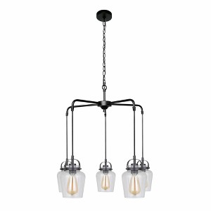 The functional minimalism of the Trystan collection with it's eye-catching silhouettes and clear glass captured globes offers innovative lighting without overwhelming your decor. Clear Glass Shades (included) Requires 5 Medium base, 60 watt bulbs (n 1 Year 12.5 Canopy Included: Yes Shade Included: Yes Canopy Diameter: 4.75 x 1 Material: Steel, Finish Color: Flat Black, Width: 27.5", Height: 22", Length: 27.5", Hanging Method: Chain, Chain Length: 72", Number Of Bulbs: 5, Wattage: 300 Watts, Dimmable: No, Moisture Rating: Dry Rated