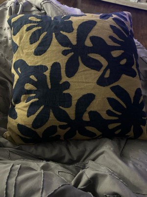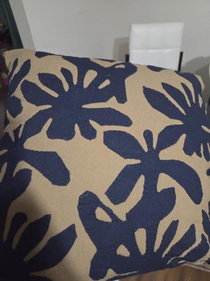 Organic shapes inspired by coral reefs and tide pools dance across a soft khaki canvas in rich indigo hues. This cotton khaki throw pillow merges abstract applique with coastal calm, adding both artistry and texture to your decor.
