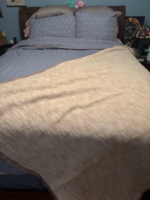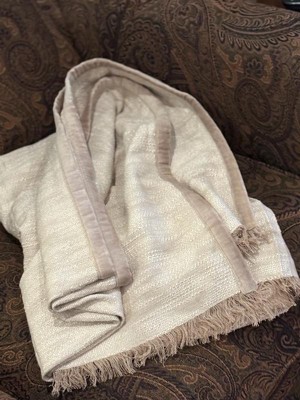 [This review was collected as part of a promotion.] This blanket is beautifully crafted with a a faux velvet trim and fringe. It’s 100% cotton and is very soft. It keeps you warm without being overly heavy. Perfect size to keep on a chair or sofa to use if you get chilly or can be used on your bed as an extra layer