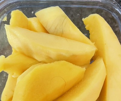 There were two black hairs on the sliced mangoes. This is the first time the container had been opened and I have long blonde hair so no way they are mine. Hard to see in the picture but you can see them if you zoom in.