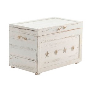 Add a coastal accent and extra storage with the Seaside Trunks set. Each trunk features a distressed whitewashed finish, rope handles, and charming star and shell embellishments. Stack them for impact or use separately throughout the home.