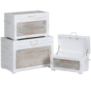 A stylish and functional set of three trunks designed for versatile storage solutions; Crafted from sturdy wood for durability and long-lasting use; A natural and white distressed finish gives these trunks a rustic, vintage-inspired look; Each trunk features rope handles on the sides for easy lifting and transport; Designed with hinged lids for convenient access to stored items; Ready to use right out of the box for instant storage and organization; Due to inconsistencies of various monitors, handheld devices, lighting, digital photography, and variances that occur naturally in materials, the color you see on your screen may vary slightly from the products received.; This product has components made of natural materials which make it unique and can lead to slight color/size variations.