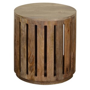 Crafted from mango wood for natural beauty and durability.; Warm medium brown finish enhances the natural wood grain.; Transitional rustic style adds charm to any space.; Simplistic drum-shaped body with long rectangular cutouts.; Sturdy construction ensures stability and longevity.; Ships fully assembled for convenient setup and immediate enjoyment.; Due to inconsistencies of various monitors, handheld devices, lighting, digital photography, and variances that occur naturally in materials, the color you see on your screen may vary slightly from the products received.; This product has components made of natural materials which make it unique and can lead to slight color/size variations.