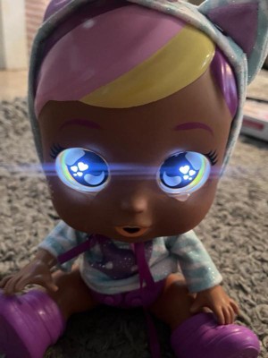 [This review was collected as part of a promotion.] It’s okay. The eye lighting up is something new to the line, otherwise it is a typical Cry Baby doll. My kid enjoyed it at first, but it isn’t too engaging. It cries and the eyes light up, and when you put the pacifier back in, the eyes still light up and the doll babbles a bit. The sun mark on the cheek is cute, as is the cat hoodie.