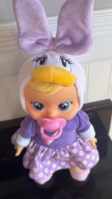 [This review was collected as part of a promotion.] My daughter fell quickly in love with the cry babies tiny Disney doll. It’s size makes it comfortable and easy for her to hold and play with and it’s small enough she enjoys sleeping with it as well. This takes no batteries to operate (parent win!) and works simply by adding water into the back of the dolls head. This area is sealed with a twist lock seal to prevent your little from opening or closing as well as preventing leaks. As a fan of Disney characters my daughter was amazed to see this doll dressed in full Daisy Duck attire. The doll comes with an attached pacifier that you either pull/push out. This is a cute and fun doll that I’m so happy with!
