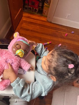 [This review was collected as part of a promotion.] Truthfully I had higher hopes for this toy. Let’s start with the pros. It is a super cute doll that’s soft and that opens and closes its eyes when it’s in a laying and sitting position. The doll makes a realistic cry when you press on its stomach and it even comes with a pretend baby monitor that makes more crying noises. Cons: I originally thought that the doll and the monitor would work together to perform some kind of function but they don’t. They both make crying noises and that’s literally it. My 3 year old daughter enjoyed it for a day but after that was a little bored with it. Overall, I think it looks cute but doesn’t really do anything that special.