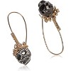- Dangle earrings featuring long ear wire with stones, and sleek skull drop embellished with pave stone accents and regal crown detail. Earrings are set in gold and hematite-tone metal with a shepherds hook closure.