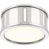 The contemporary Kendal collection makes a statement with its graphic uniform pattern. Its metal frame surrounds white glass in this elegant drum-shaped ceiling mount. The high contrast of Vibrant Gold, Black Forged, or Polished Nickel against white glass is a great way to add a touch of drama to a room. Kendal collection features a versatile modern / contemporary design. / A balanced blend of traditional and contemporary elements, featuring clean lines, neutral finishes, and subtle detailing, offering versatile designs that complement a variety of interiors. / The rectangle cutouts in the Kendal feature the illuminated white glass. / The Vibrant Gold metal finish has a softer gold color. This finish adds sophistication to any space and pairs elegantly with traditional, transitional, and contemporary d�cor. / 9.5"W x 4.5"H x 9.5"D / 2 light 60- watt, E12 Candelabra base / Steel + Glass / Authorized for use in damp, high-humidity interior locations or protected exterior locations. Meet