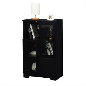 - Black Color Design: Modern style and decorative 2 doors with glass inside make it fascinating in any room space.No handle design feelings of exquisite. Combining elegance, modern feeling. Unique appearance and classic style make it matched in kinds of living space styles. This storage cabinet being practical to meet various storage needs.