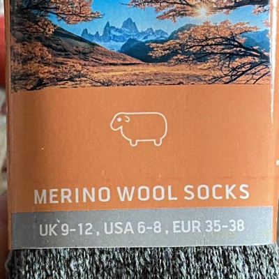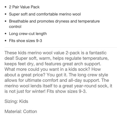 I love that I found a natural fiber (possibly?) sock. I thought merino! But your description also says cotton. So… merino cotton blend? Works for me. Ordered a navy 2pk and a gray 2pk. They arrived and they looked small. The description says they fit children’s shoe sizes 9-3. My son is a size 13.5 or 1. The navy socks were 2” too short for his foot (the heels were at his arches!) and the grey were about an inch too short (the heels curve was under his heel). We got these for hiking so the fabric felt nice for that. Heavy but breathable. The socks are sturdily made! But the sizing is way off. These might fit toddler feet well, but they are definitely not made to fit children wearing shoe size 9-3. Or 9-13. Perhaps they meant 3-9?? But the package says they fit kids US shoe size 6-8, and I am assuming they mean toddler size 6-8. I’d give them 5 stars for value (if they fit) but I cannot assess comfort as they don’t fit remotely. I’m taking two stars because the description (ss included) is so very wrong when it comes to size. We are returning if possible or donating if not. Great quality socks! But beware the sizing issue!!