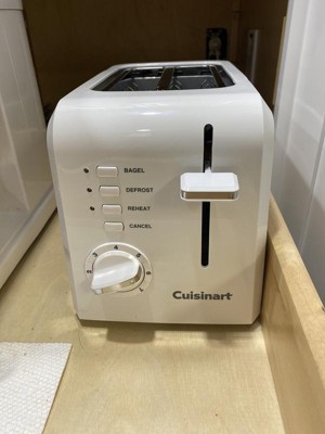 Take control of your toast with the Cuisinart 2-Slice Compact Plastic Toaster, which boasts seven shades of toasting. This compact toaster saves space, whether placed sideways or facing forward to fit any kitchen counter or even dorm room. Whether you want a thick toasted bagel to snack on, toaster pastries, or thin sliced bread for a healthy twist on croutons, the wide slots and high-lift carriage make it easy to toast every time.