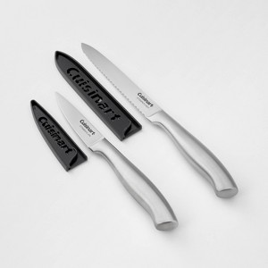 Cuisinart - you can't go wrong. Always quality. Paring knife and serrated knife. These were very well priced! Stainless steel, no separation between blade & handles, so no coming apart with age. Hollow handles so they aren't too heavy. Nicely balanced in the hand. Very Sharp! Last for years!