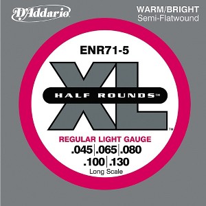 Gauges: .045-.065-.080-.100-.130 Wound with pure nickel, then precision ground, leaving the outer surface smooth and "semi-flat." They retain the flexibility and many of the tonal characteristics of round wound strings. Half Round heat-treating process increases the brightness of the strings. Long scale.