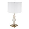 The Design As contemporary as it is intriguing, this table lamp features three round alabaster accents, two vertical and one horizontal, a classic white drum shade, and a gold aluminum base. Measuring 26.3H x 14D x 14W, it is an ideal size for your bedside table, a desk in your study, or an end table anywhere in your house. Minimal assembly is required for the collapsible drum shade.