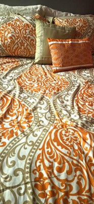 A: The Damask Chelsea Comforter Set from Target is available in two color options. The Aqua version features a vibrant damask pattern in aqua and white, offering a fresh and calming look that’s great for brightening up a space. The Orange version combines bold orange with taupe, creating a warm and earthy feel. Both options showcase the same elegant damask design, allowing you to choose between a cool or warm color palette depending on your style preference.