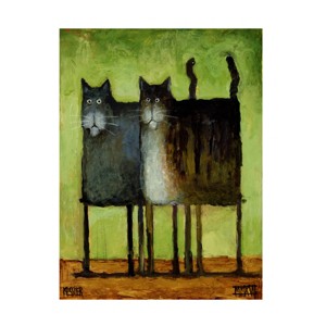 This ready to hang, gallery-wrapped art piece features two cats in the center of a green scene.