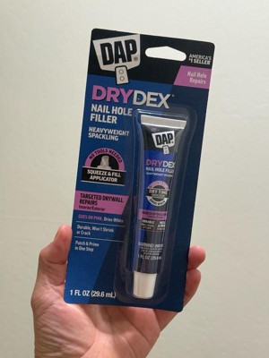 [This review was collected as part of a promotion.] I have used DAP DryDex for years with my walls, as my initial confidence in my vision usually does not end without many nails moved. I already knew DAP was going to work well, but this squeeze tube is a GENIUS MOVE!!! I am SO glad I don’t have to dig into a tub and overuse the spackling, it literally goes right into the nail hole and I don’t have to touch it. The pink-to-white dry time indication is also SUPER helpful for me, as I’m usually moving between projects and am not very good at keeping time between when I applied it and when I can sand it down a bit to paint. I love this product so much and will use it for many years to come!!