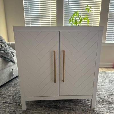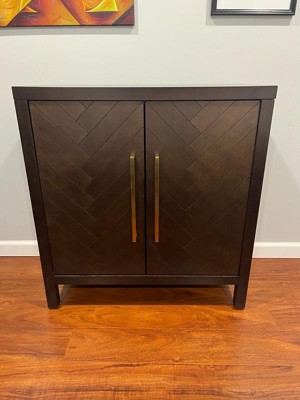 I bought this cabinet for my guest bedroom. I have a 19" flat screen tv setting on top of it and I use the shelves to store my granddaughters books and some legos for when she is here. It is a nice modern/transitional style. The chevron pattern on the doors and the brass handles make it look expensive. It came in very good shape. My son-in-law put it together with a couple sizes of phillips head screwdrivers in about an hour. Only issue is that screws for the back panel did not have holes pre-drilled for them. With a little elbow greese he was able to insert the screws as the wood was soft enough. It is very solidly built. Only ding was on an interior side panel which does not show. It is a dark walnut. I would recommend.