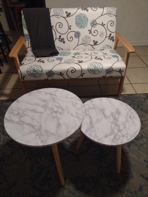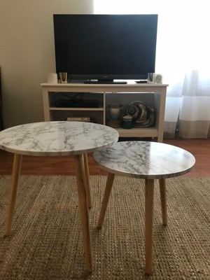 Great nesting tables that I am using as a coffee table set up. The grey marbling is darker than it is in the online photo (I like the contrast). Set up was SO easy! These are also lightweight and easy to move, although the smaller table is a little less stable since the legs/base is not as wide. Great price for what I needed.