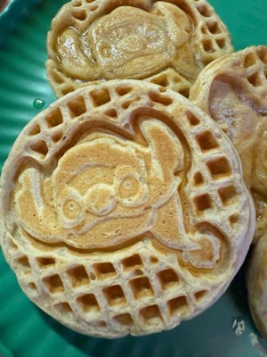 [This review was collected as part of a promotion.] This waffle maker is absolutely adorable!!! First it makes waffles in just minutes. The ceramic plates make for even heating and the perfect non-stick cooking surface! The plates are dishwasher safe and hand washing is a breeze! Simply mix up your favorite waffle mix pour it in the waffle maker and in minutes you've got perfectly cooked waffles! Then add the Santa Stitch image and the kids love them! I made mocha waffles but try doing buttermilk and add some food coloring to make the stitch image even more impressive!