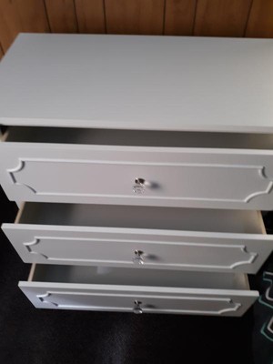[This review was collected as part of a promotion.] This dresser is beautiful with it’s pristine white color and clear jewel knobs. I have a white crib and this went perfectly with the elegant princess theme I am working on for my baby’s nursery. The drawers slide easily which is great for getting into one handed since I usually have my 3 month old baby in my hands. The drawers are roomy enough to keep all her clothes, blankets, crib sheets, towels, and burp cloths within the 3 drawers. The dresser looks great by itself, but I use mine as a changing table as well as the top is a perfect size to accommodate my changing pad. My husband was able to assemble the dresser in about 2 hours following the given directions. The only issue he had was there are 3 holes to attach the drawer to the track, but the middle hole doesn’t align if you do the 2 outer holes first, although it does not affect the functionality of the drawers at all. I highly recommend this dresser for any nursery or little girls room.