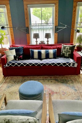 We were inspired in our recent LR redo by designer max Humphrey’s new book, Modern Americana. I wanted to mix modern + vintage + to layer our rugs, so I paired this 10’ x 7’ chunky jute rug with a 5’ x 7’ pattern jute rug, also from Target. I love how all our new pieces from Threshold with Studio McGee fit with my mix of modern + vintage style. This rug is definitely chunky + squishy + soft - our cat lies down on this rug UNDER the chair sometimes, because it’s so soft!