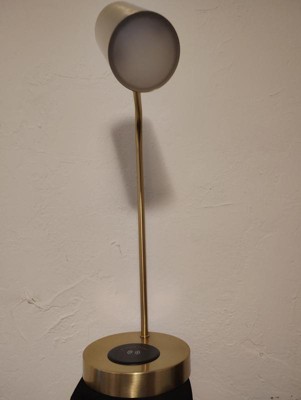 Table light is gold in color. It swivels forward and back but the movement is limited. It has a wireless charging spot. The button to turn the light on is touch so there isn't an actual button.