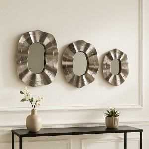 Bring timeless elegance and versatility to your home with this set of three silver mirrors, crafted with durable metal frames and finished in a warm silver tone. Designed as both functional and decorative accents, these mirrors brighten rooms, reflect natural light, and add dimension to any wall. Their sculptural round silhouettes and unique cut-out design make them stand out as striking focal points, while the 17", 21", and 25" sizes allow endless styling options. Hang them together for a dramatic arrangement or separately to highlight multiple spaces, achieving the visual impact of a full body mirror without overwhelming your room. Ideal for apartments, living rooms, or entryways, this set provides the reflective charm of a floor mirror in a compact, versatile format. The varying sizes can mimic a full length mirror with stand when styled vertically, or create a wall mirror full length effect in a hallway or bedroom where light and space feel limited. Larger walls benefit from their floor length mirror impression, helping to expand and balance your decor, while their presence can even evoke the grandeur of a big mirror in a smaller footprint. Perfect for a stand up mirror alternative, they bring daily functionality with an elevated design touch. Whether styled as a bedroom mirror ensemble above a dresser, grouped as round mirrors for wall decor, or paired with modern accents, they adapt seamlessly to many home aesthetics. The distinctive border edge creates the unique feel of an asymmetrical mirror, adding personality to your walls while keeping the look sophisticated. Use the smallest piece as a small hanging mirror in a bathroom or nook to finish your arrangement with style. More than just wall accents, this set of three decorative silver mirrors delivers everyday utility, long-lasting durability, and a timeless upgrade to any space.