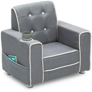 The Chelsea Kids Upholstered Chair with Cup Holder from Delta Children will give your little one a comfy place to read or relax. Button tufting on the back and contrasting piping adds grown-up style to this child-size chair while the built-in cup holder and storage pockets on the sides adds convenience. A chic addition to any children's bedroom, playroom or the living room, this chair is crafted with a sturdy wood base and a generous foam fill to ensure it is as comfortable as it is stylish. Chair coordinates with other items in the Chelsea Collection from Delta Children.