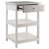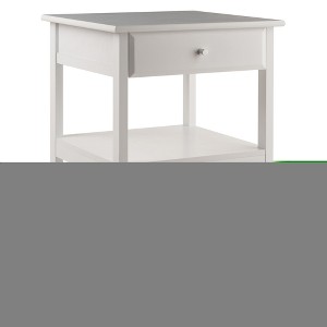 The table features a soft-close drawer with a silver accent pull and two open shelves that provide plenty of storage space. Made of composite wood in White finish. Assembly required.