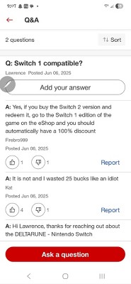 This code is only for the Nintendo Switch 2 version of the game, even though the title does not clearly state this. If you purchase this in error for the Switch 1, Target will not refund the purchase despite admitting that the title of the item is indeed misleading. There is a solution though if this does happen to you. Do the following: 1. Go to "ec.nintendo.com" and redeem the code online after signing in with your Nintendo account. It will say that your code is not compatible with your device. Proceed anyway. 2. Go to the Nintendo shop on your Switch 1. Find the Switch 1 version of Deltarune and proceed to purchase. 3. When you get to the last screen, it will present you with an option for a free download of the Switch 1 version of Deltarune for already owning the Switch 2 version. Target, fix the title of this item.