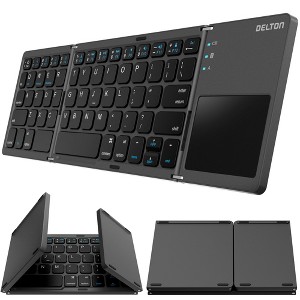 Transform your typing experience with the Delton F75 foldable Bluetooth keyboard, an ultimate tool for the on-the-go professional. This ergonomic keyboard folds down to a mere 6" x 3.8", easily sliding into your backpack. It's equipped with Bluetooth for a rapid, stable connection and features a touch pad with full gesture support for effortless navigation. The long-lasting rechargeable battery provides up to 50 hours of continuous use, ensuring you stay productive throughout the longest work sessions. Designed with precision in mind, this portable keyboard offers quiet keys and a comfortable layout for accurate typing, and it is compatible with all your devices, including laptop/PC, tablets, and smartphones, across different operating systems, such as Windows, macOS, and iOS. This keyboard's lightweight build doesn't compromise durability, making it a reliable travel companion.