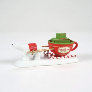 Everyone who purchases tea at the Peppermint tea shop is invited to take home one of their finely crafted tea cups. This diligent polar bear wears a red saddle pad that reads "TEACUP DELIVERY" and leads this teacup delivery service. The red sleigh is designed like a teacup with gold stripes, a green border and peppermint skis. It reads "Peppermint Tea Shop" and is filled with packaged tea cups for their loyal customers. Add this cute figurine to your collection today.