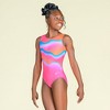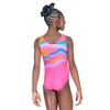 • Bright pink tank leotard with eye-catching orange & teal watercolor ripple design