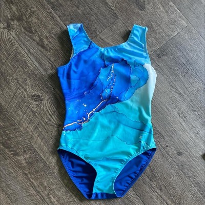 Tidal Wave is an elegant split-back tank leotard made from our signature buttery soft fabric. The watercolor pattern with printed gold accents ripples in blues and greens with a solid navy back. Feel the strength and poise to elevate your gymnastics or dance routine’s flow in Tidal Wave. Matching scrunchie included.