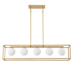 - Elegant Modern Style – 5-light rectangular island pendant with deep gold iron frame and white frosted glass globes.