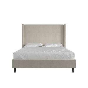 The RealRooms Evie Upholstered Wingback Platform Bed is your first-class ticket to a luxurious night's sleep. With its extra-tall headboard and wingback design, this bed offers ultimate comfort and support. Standing at an impressive 54 inches, the padded headboard is perfect for lounging and reading the latest acclaimed book hot off the presses. The modern and contemporary style of its soft-textured fabric upholstery bestows a level of pristine refinement on any bedroom, be it your master suite, guest room, or teen's space. And cushioned panels add a layer of coziness, while the 5-inch-high conical black plastic legs deliver depth. Featuring roll-out plywood slats that easily fasten onto the rugged wood bed frame and uplifting metal center legs and side rails, you can scrap your plans for an unnecessary box spring or foundation. Compatible with all mattress types and boasting a 1000-lb. weight limit, the Evie is practically foolproof and is offered in King or Queen size.