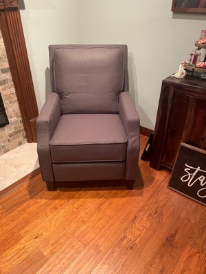 [This review was collected as part of a promotion.] Even my husband gave his rare stamp of approval with this chair! It’s really comfortable in a firm way. It’s not very cushioned, but it’s not hard either. The “push back” recline is easy to engage. It’s a stylish look, with a nice gray-slate color. The faux leather is soft, and easy to clean (though it is a bit of a dog-fur magnet if you have pets like we do). It’s VERY durable, and very well put together. The instructions were clear, and assembly was quick and easy. I definitely recommend this chair for anyone looking for a sturdy, stylish staple piece of furniture.