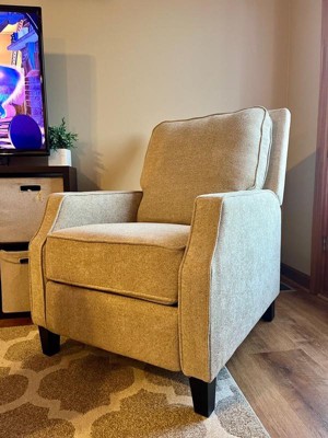 [This review was collected as part of a promotion.] This is one of the most comfortable chairs I’ve ever had! Which honestly shocked me considering it’s more of a style design than comfort, or so I thought! It’s very plush but firm I don’t know how to truly explain. I can say I honestly love the material it’s a speckled oat cream color and the material is resistant to staining or water spills etc. it reclines perfectly not to much and has a smaller leg area than usual recliners but that is a good thing because this is for the women in the house! Even though my husband steals my chair now all the time and even has his own chair! This is so great! And very beautifully made design wise and quality work of material! 100 out of 10 for me!