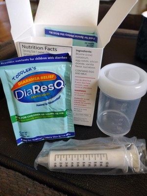 While this product seems great for helping toddler's with diarrhea, it's rather cumbersome to mix up. It involves pouring the powder packet into the provided cup, adding water, placing the provided lid on the cup, shaking & then using the provided syringe to measure the dose. On another note, my daughter will not drink anything but water & when it comes to medicine, she's okay with bubblegum flavored meds. DiaResQ is "vanilla" flavored & I could not get her to ingest it. Note that it also contains dairy & egg.