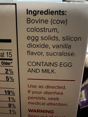 bovine (cow) colostrum, egg solids, silicon dioxide, vanilla flavor, sucralose.' '