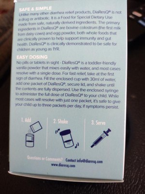 DiaResQ Diarrhea Relief is a combination of immune factors and important nutritional components with no side effects commonly associated with drug treatments. It is a must-have travel essential. It is not intended to relieve chronic diarrhea or diarrhea due to overindulgence in food or drink. It addresses the underlying issue of diarrhea, not just the symptoms. Diarrhea is often caused by your body’s immune response to an unwanted microorganism in the gut. DiaResQ Gentle Diarrhea Relief provides nutrients and immune factors that help support your body’s response and rapidly restore normal intestinal function. Just add one packet of immunity powder to 30 ml of water. Shake the mixture until the contents are combined, and immediately drink it or administer with the included syringe. Take additional packets as needed. Up to three packets per day. DiaResQ upset stomach relief for children is not a replacement for medications prescribed by a doctor or a replacement for your normal diet. Not intended for infants (12 months and younger).