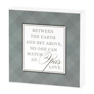 Wall sign features a sentimental message with beautiful artwork that will add interest to your decorating spaces; Inspirational artwork has an uplifting message that reads, "Between the earth and sky above, no one can match an Opa's love."; Made of medium density fiberboard with print overlay design; Measures approximately 5 x 5 inches; Flush mount, keyhole hanger for easy installation; Proudly made in the USA; Ships in protective packaging