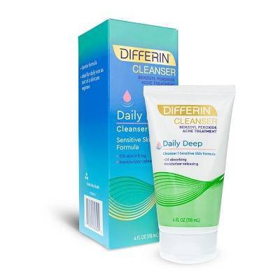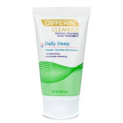 Differin Daily Deep Cleanser with Benzoyl Peroxide, 4oz is a dual-action formula containing benzoyl peroxide which penetrates deep into pores and absorbs excess oil while releasing a gentle moisturizer that won't clog pores.