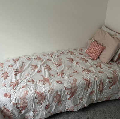 This comforter looks super cute however the material is very scratch and stiff and doesn’t seem to soften with washing. My other complaint is that if you buy the blue set there’s all sorts of decorations that fit the theme but for the pink set there’s the sheets and that’s it. It makes it hard to decorate a dinosaur theme for a girl. I ended up finding a new set on Amazon