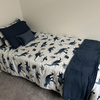 Add a whimsical touch to your child's room with the Dinosaur Comforter Set from Pillowfort™. This two-piece bedding set includes a cozy comforter and a matching sham for coordinated flair. Both pieces are adorned with allover prints of different dinosaurs with their names and tropical leaves in peach shades against an off-white background for a roar-some effect, and reverse to a coordinating peach finish on the other side for an elegant contrast. 100% cotton shell ensures soft, comfortable year-round use, while the cozy comforter with polyester fill adds a layer of warmth to the top of their bed. Add coordinating sheets and other bedding pieces to complete their bedding ensemble, then machine wash for easy care.