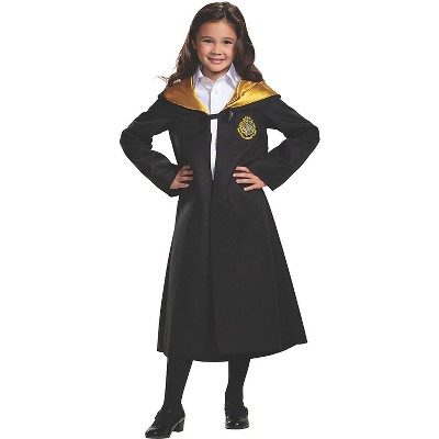 This costume includes a robe with hood and jumpsuit that is designed to look like a white shirt with tie under a gray sweater and pants. The long black robe features a red lining, Gryffindor emblem on chest and black robe clasp. Care Instructions: Hand wash cold water with mild soap. Tumble dry low. For best results hang or lay flat to dry.