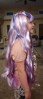 [This review was collected as part of a promotion.] My daughter was thrilled with this costume wig! The picture on the package is exactly what you get. The colors are beautiful and the wig has a strap that attaches similar to a bra strap for extra security. She loved it and she’s pretty picky about her stuff these days. She’s 7 years old, about 4 ft tall and the wig fit just as pictured on the model. Would make for a great unicorn, fairy, my little pony, monster high, even care bear costume perhaps!!